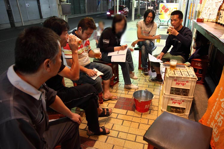 おじさん 商店街の通路で 一杯飲んだのは 初めての経験でした 。